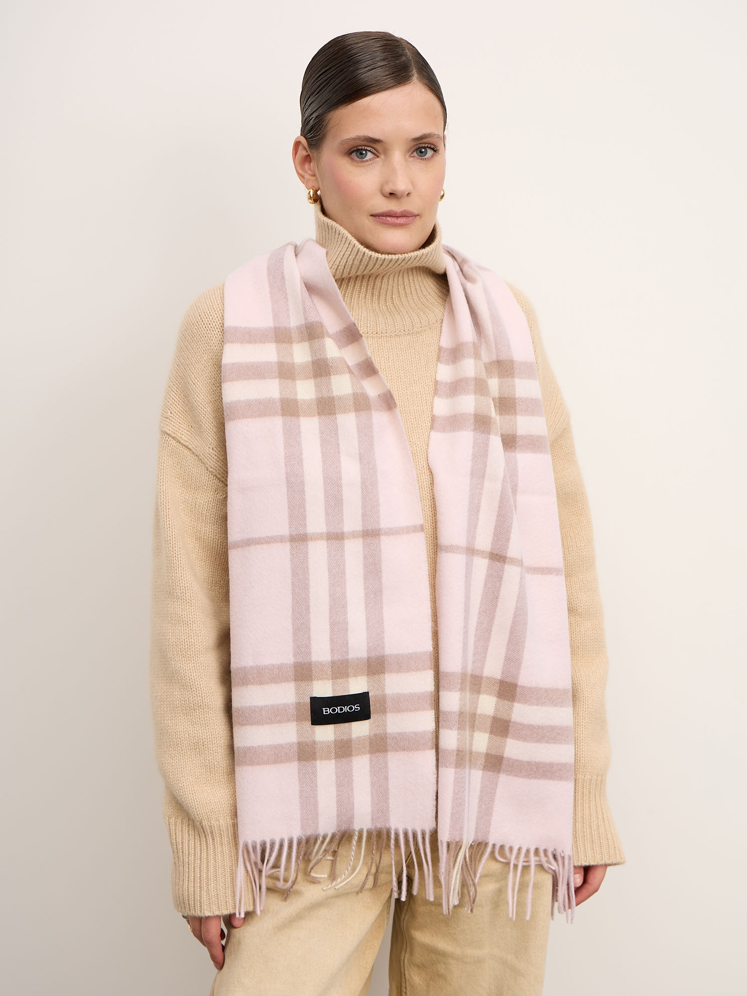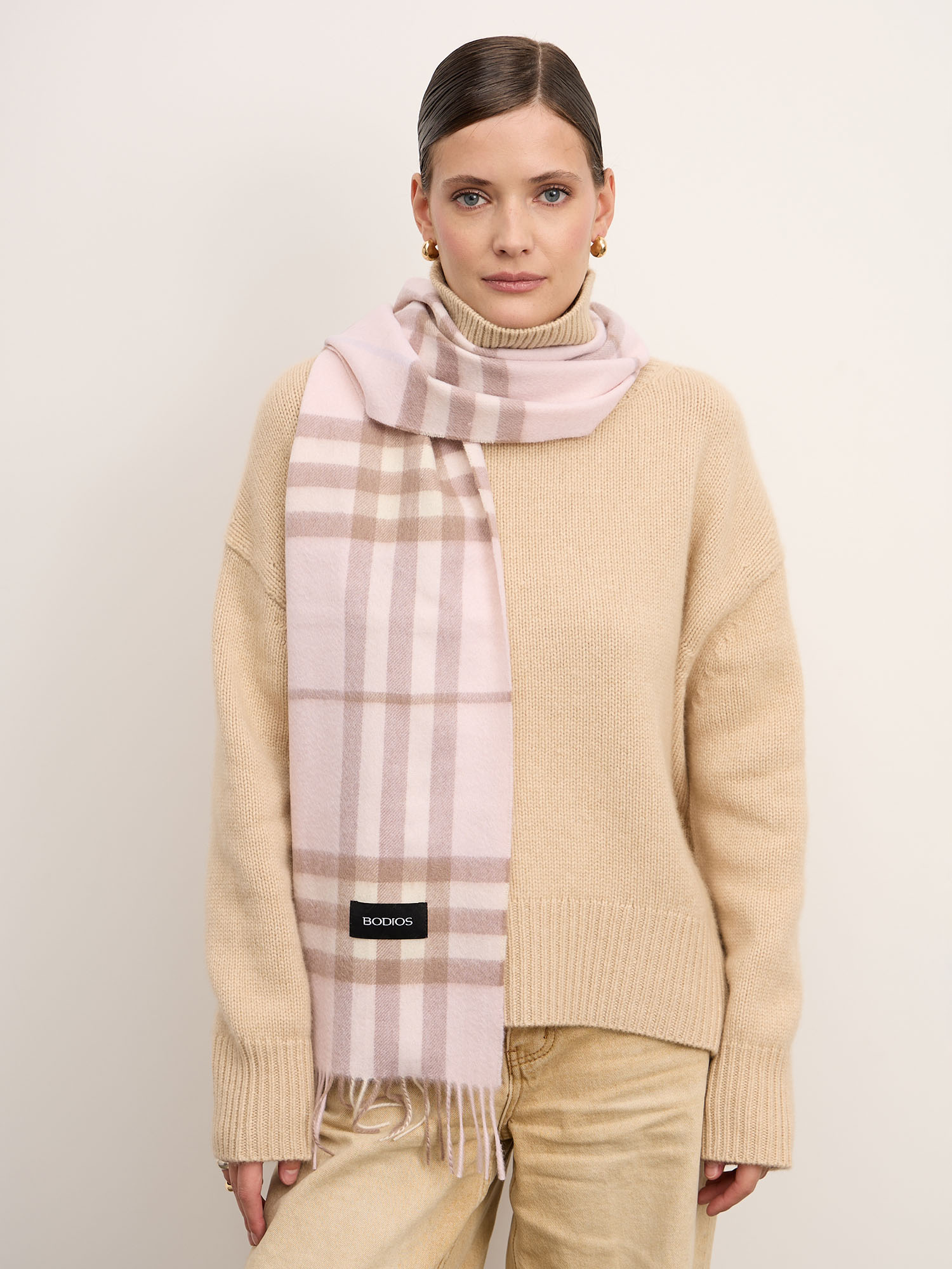 Нежный розовый оттенок с клетчатым рисунком в бежевых и светлых тонах создаёт мягкое и гармоничное сочетание, которое добавляет образу женственности и лёгкости.