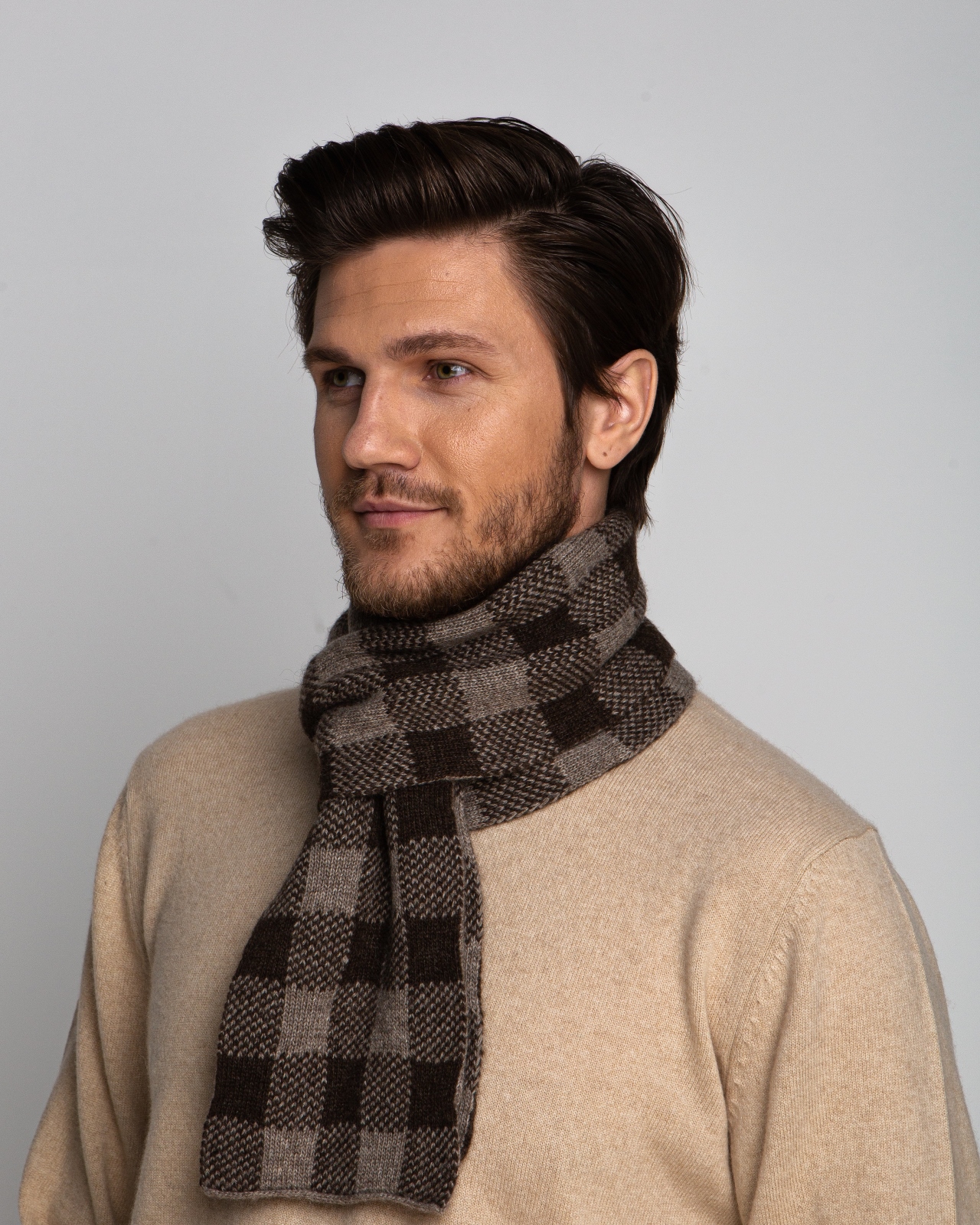 Сочетание коричневых и бежевых оттенков в клетчатом рисунке. Гармоничная природная палитра легко сочетается с базовыми цветами гардероба и подчеркивает элегантность образа.