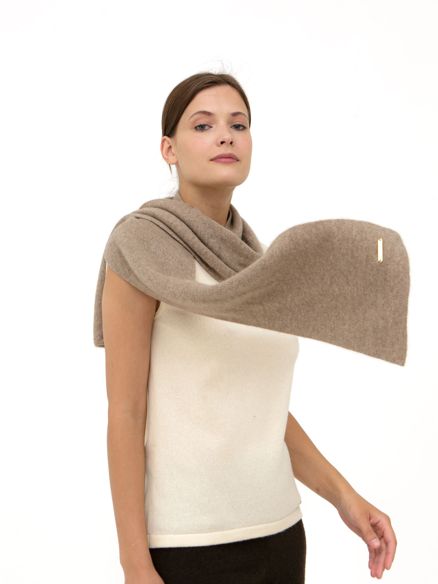 Классическая прямоугольная форма с лаконичной гладкой фактурой. Минималистичный дизайн подчёркивает натуральную красоту кашемира и делает аксессуар универсальным для различных образов.
