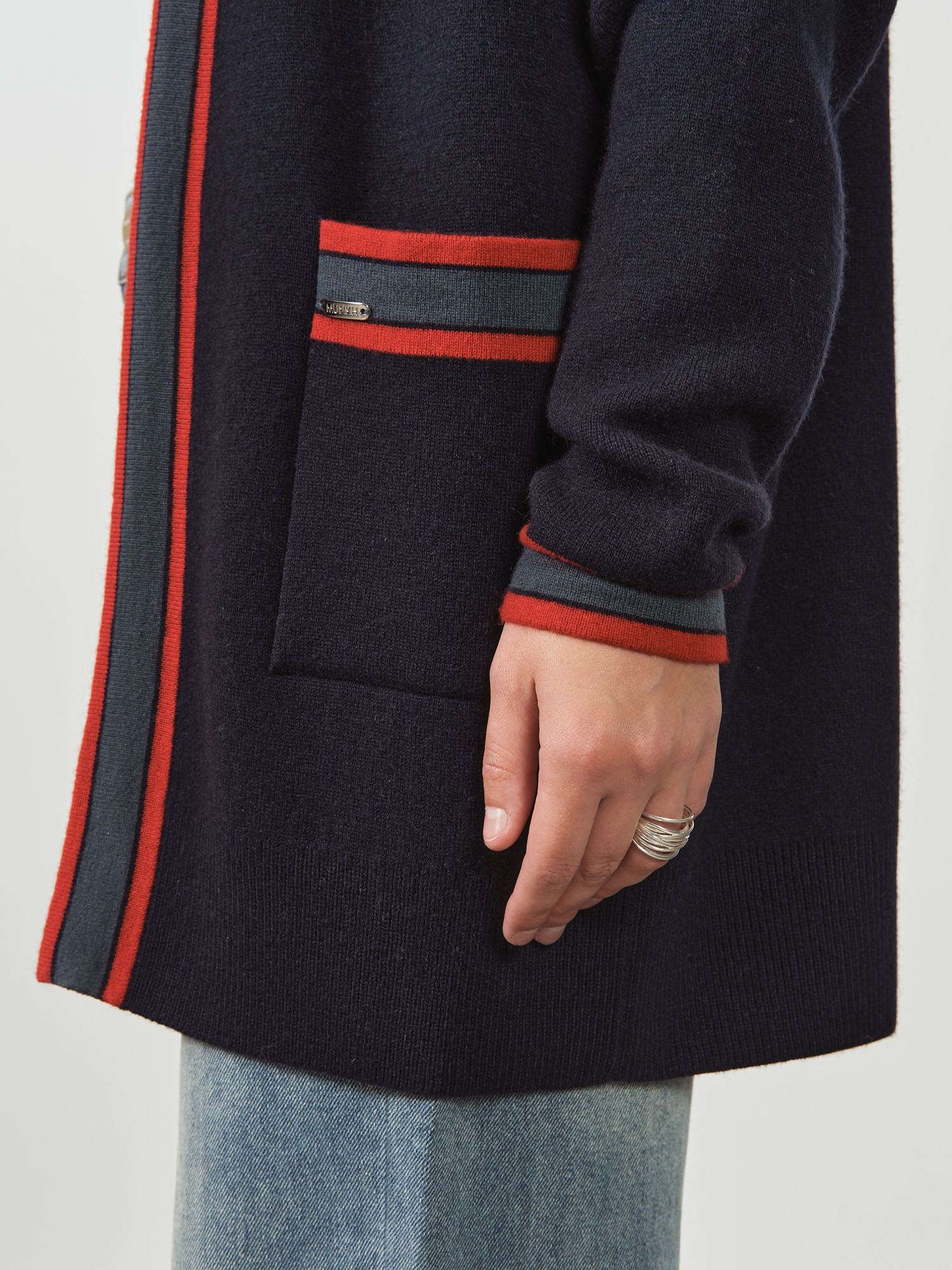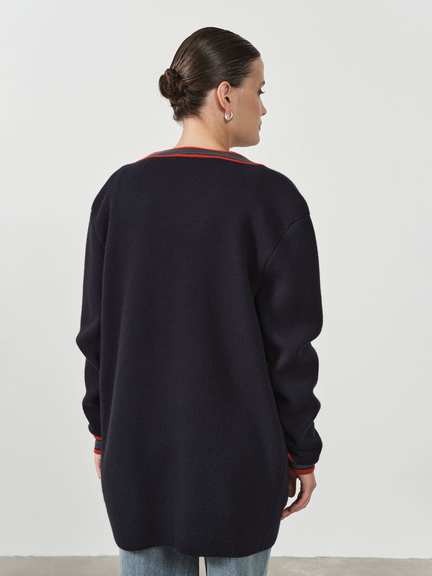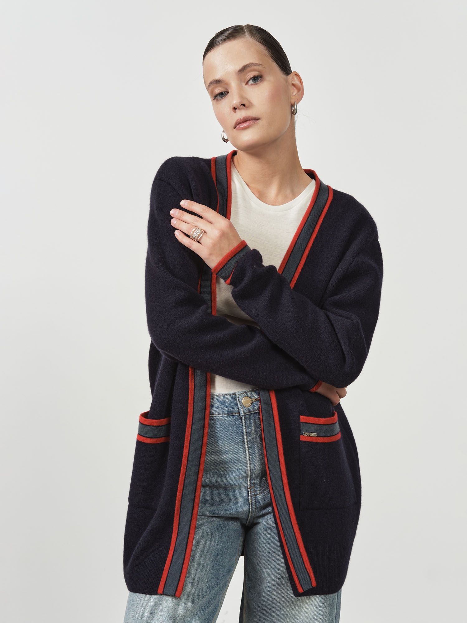 Контрастная отделка по краям, планке и карманам придает модели графичность и современный характер. Открытый фасон без застежки делает кардиган универсальным для многослойных образов.